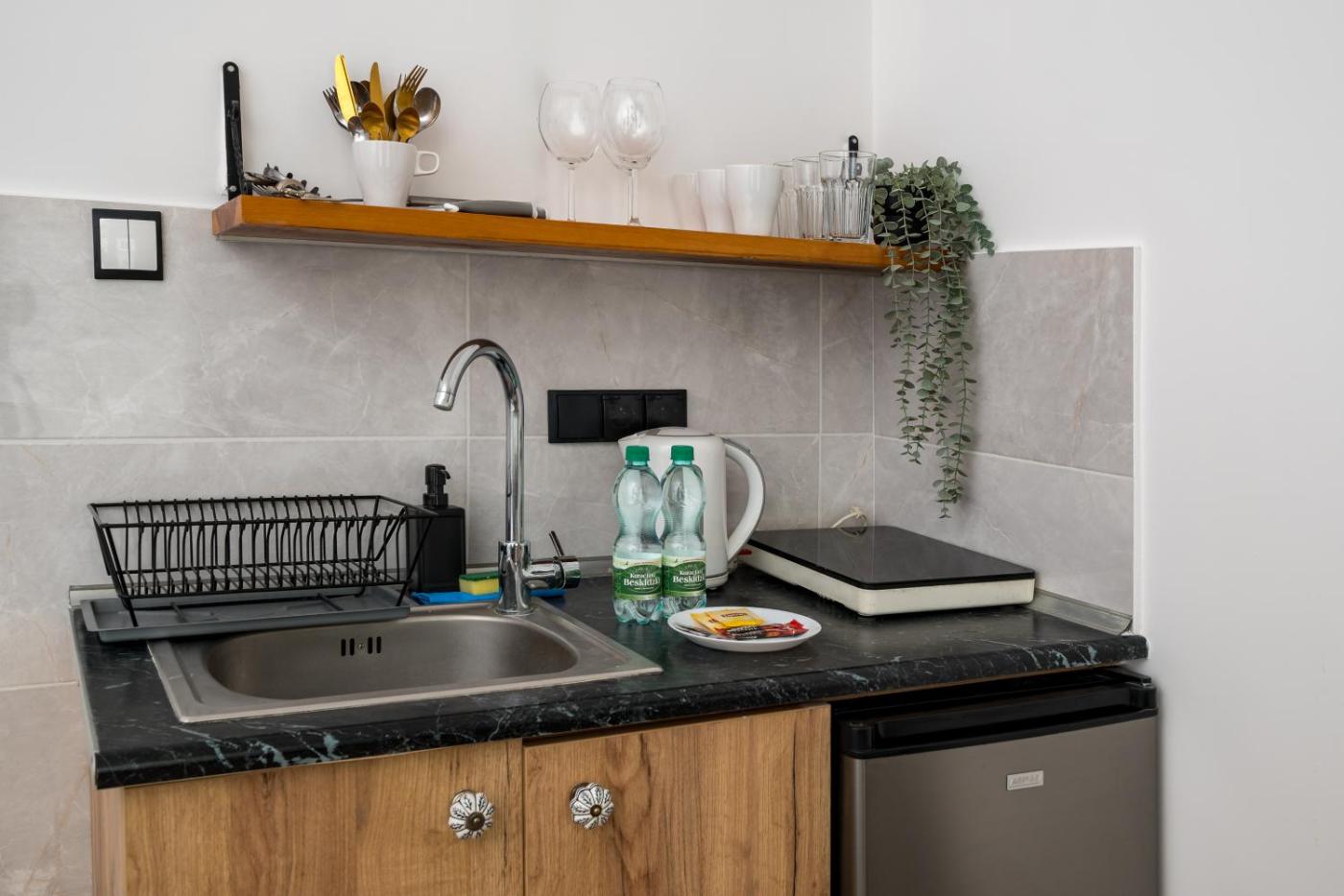 Studio. The studio offers a private entrance, a tea and coffee maker, as well as a private bathroom featuring a shower and a hairdryer. In the well-equipped kitchenette, guests will find a stovetop, a refrigerator, kitchenware and a toaster. The studio provides a flat-screen TV, a dining area, a wardrobe and heating. The unit offers 1 bed. Studio - 2 osobowy. Powierzchnia pokoju ok.: 24 mkw. ;