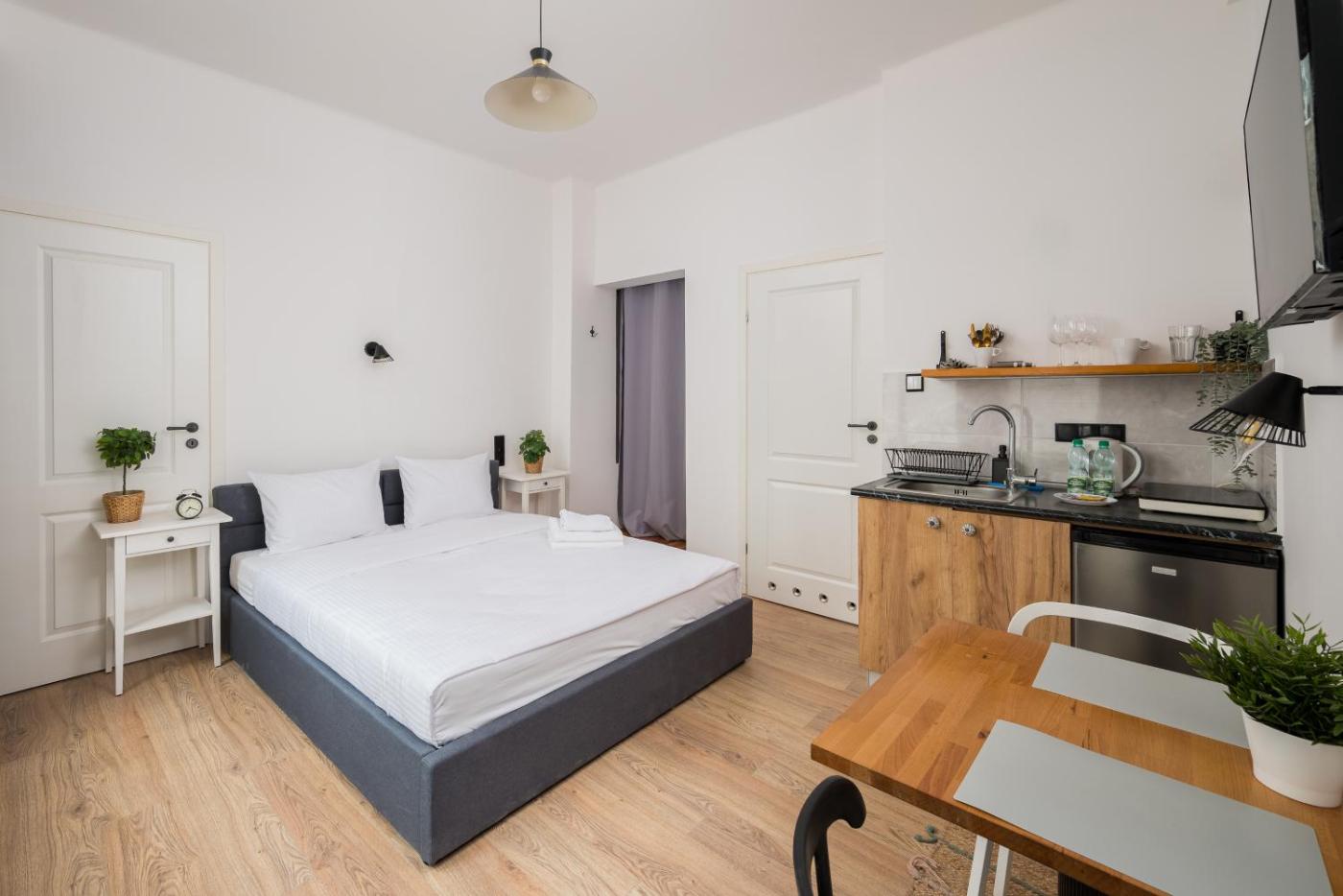 Studio typu Deluxe z łóżkiem typu king-size. In the kitchenette, guests will find a stovetop, a refrigerator, kitchenware and a toaster. The studio offers a private entrance, a tea and coffee maker, as well as a private bathroom boasting a shower and a hairdryer. The unit has 1 bed. Studio - 2 osobowy. Powierzchnia pokoju ok.: 19 mkw. ;